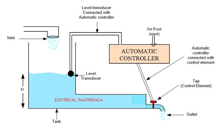 In this example, we have a task that we must maintain the water level at a desired height (say 5m). This 5m value is the input (or set point) to the automatic controller, it means that automatic controller will compare the new height with this set point. A level transducer is placed in the tank to measure the current height of water in the tank, this level transducer is connected with automatic controller, now the value(new height or output) given by the level transducer is compared with the set point(input) by the comparator.